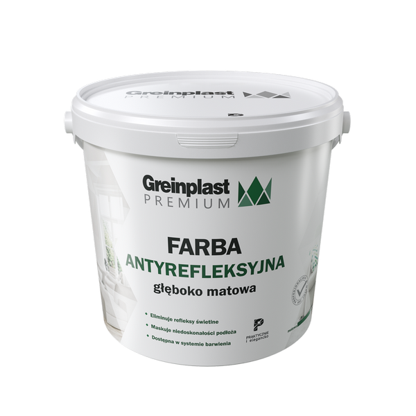 Lateksowa farba antyrefleksyjna Greinplast Premium do zastosowań wewnętrznych charakteryzuje się bardzo niskim kątem odbicia światła, wysokim stopniem krycia i doskonałą wydajnością. Bardzo dobrze sprawdza się do malowania sufitów oraz innych powierzchni, które nie są idealnie gładkie lub padające na nie światło uwypukla nierówności. Farba antyrefleksyjna Greinplast Premium charakteryzuje się także wysokim stopniem krycia i doskonałą wydajnością. Może być wykorzystywana do wymalowań pierwotnych i renowacyjnych w ramach wykonywania wewnętrznych powłok malarskich, zarówno o charakterze dekoracyjnym, jak i ochronnym.