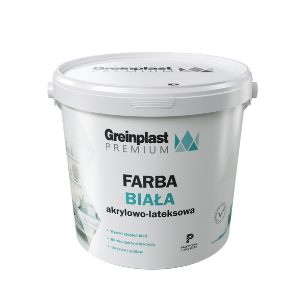 Farba biała akrylowo-lateksowa wewnętrzna do aplikacji ręcznej i natryskowej. Gotowa do użycia, przeznaczona do ochronno-dekoracyjnych powłok na betonie, tynkach cementowych, gipsowych, płytach G-K i tynkach mineralnych. Idealna do renowacji istniejących powłok malarskich.